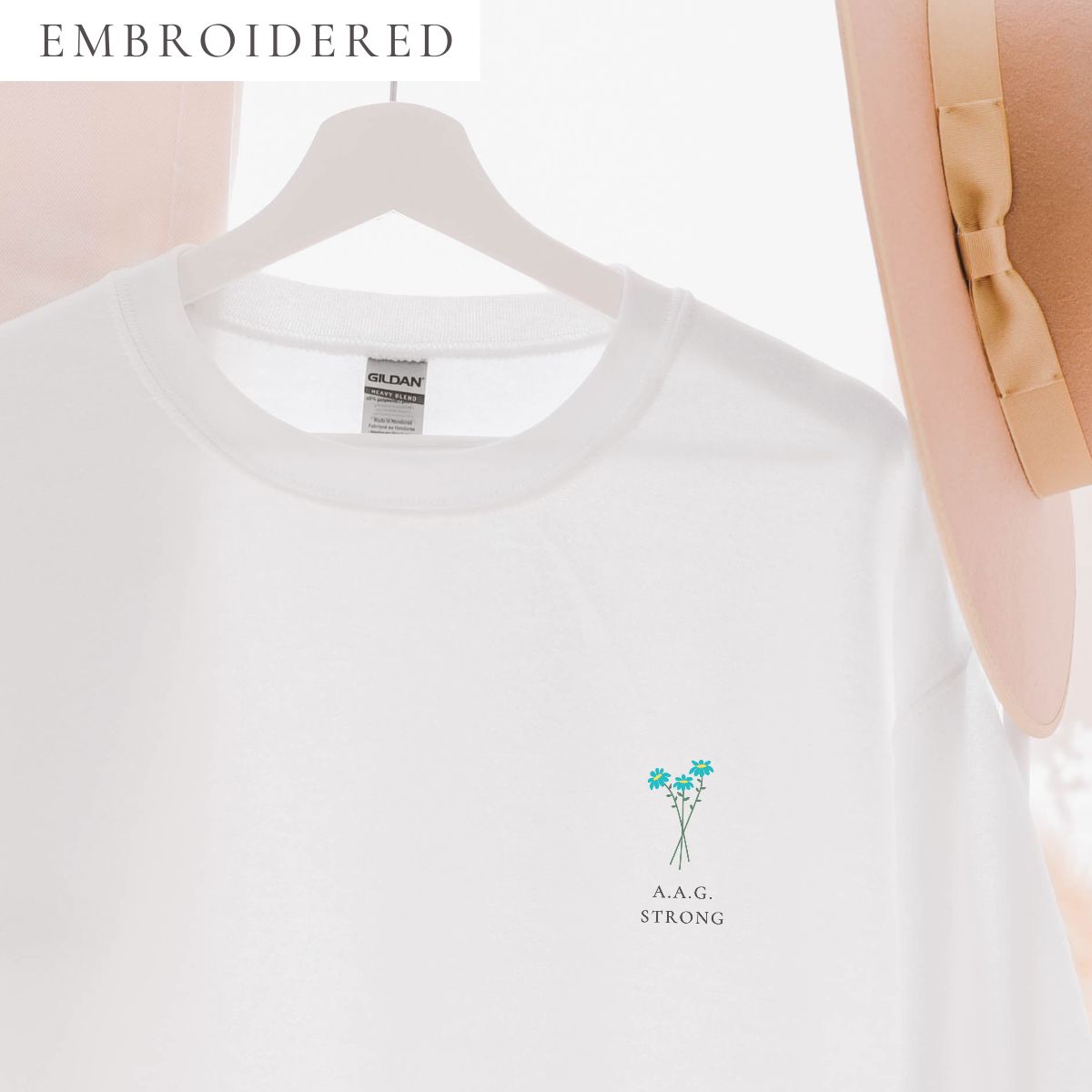 IMAGE ID: Unisex Crewneck With The Three Flowers Above The Specific Disease And the Word “Strong” Embroidered In The Top Left. Available In Black, Dark Heather, Indigo Blue, Light Blue, Sport Grey, Light Pink And White.