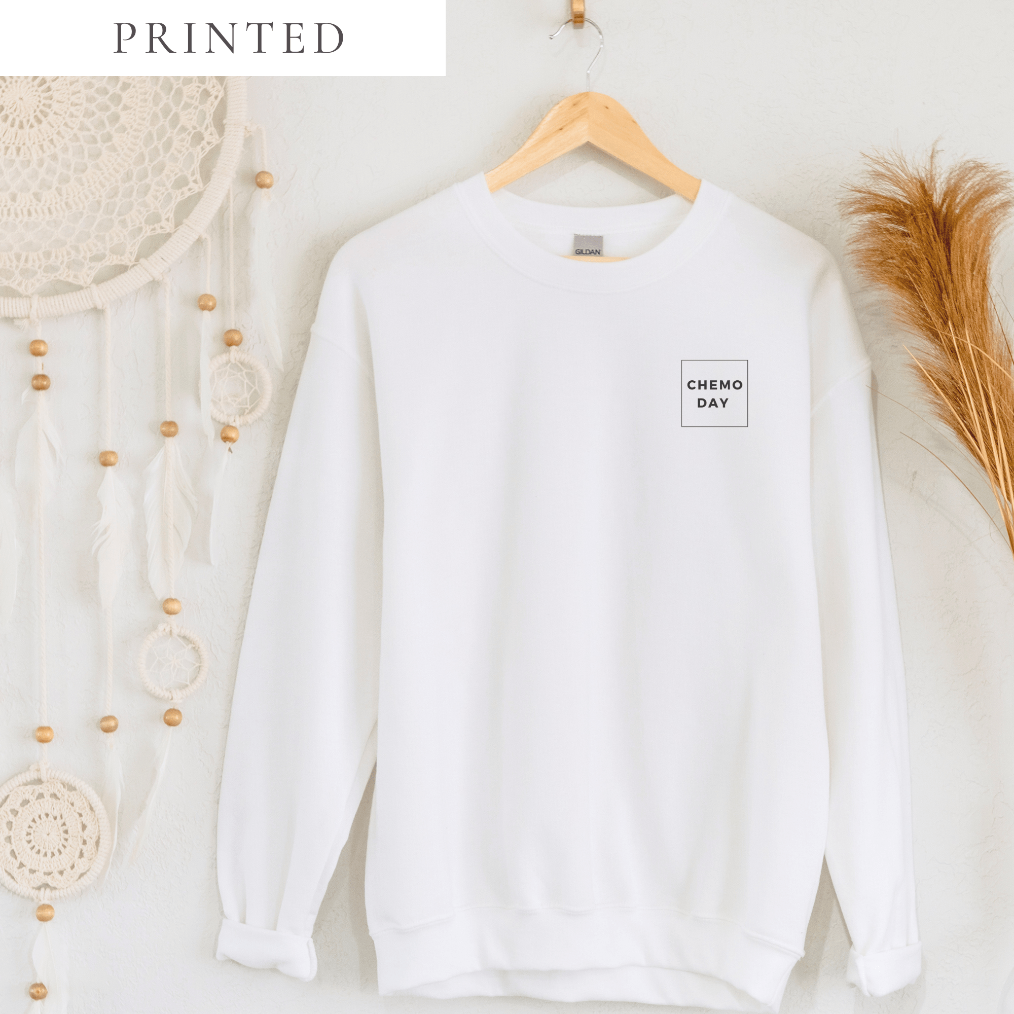 IMAGE ID: Crewneck With The Words “Chemo Day” In The Top Left. Available In Multiple Colors.