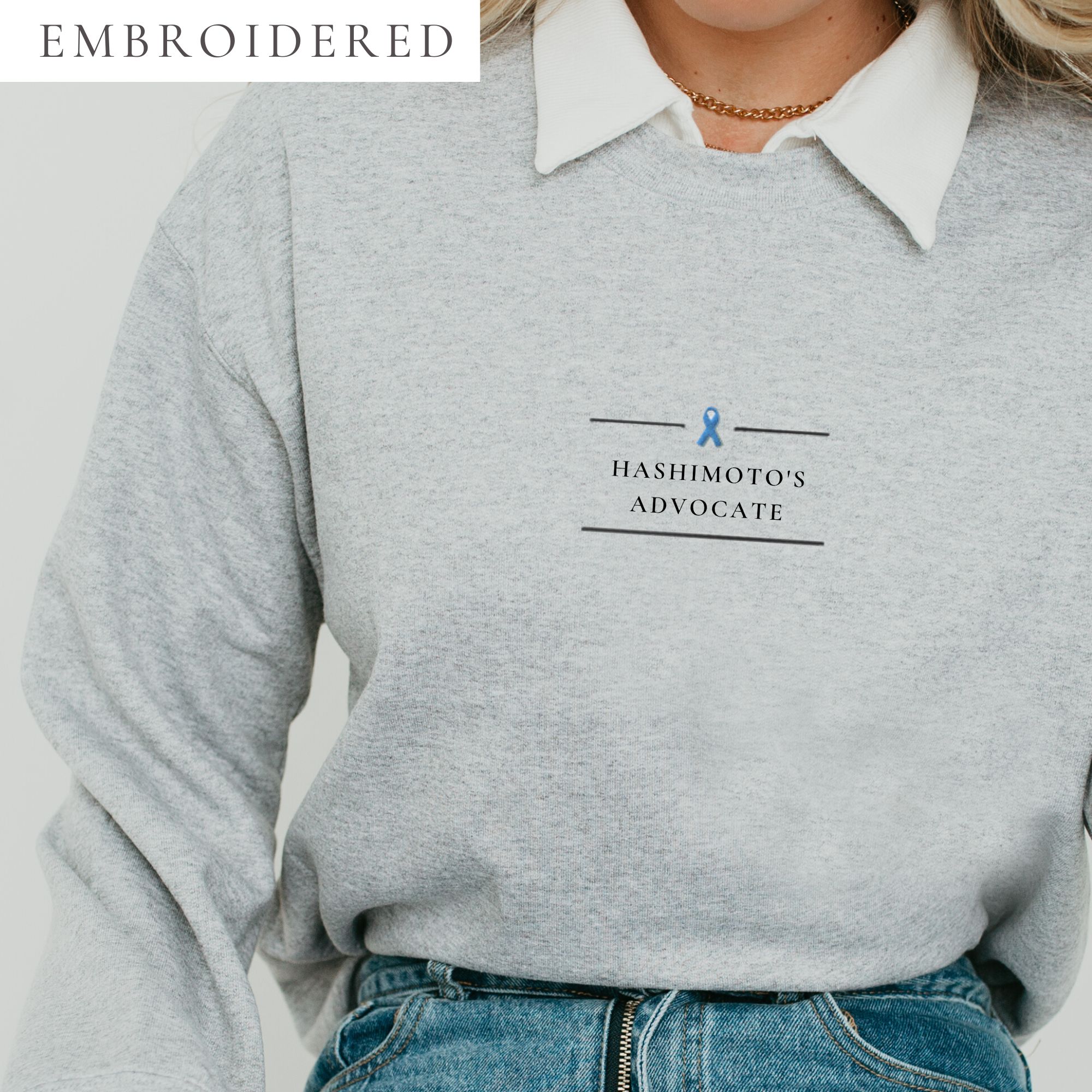 IMAGE ID: Unisex Crewneck With The Awareness Ribbon Above The Name Of The Specific Disease Followed By The Word “Advocate” Embroidered In The Center Of The Chest. Available In Black, Dark Heather, Indigo Blue, Light Blue, Sport Grey, Light Pink And White.