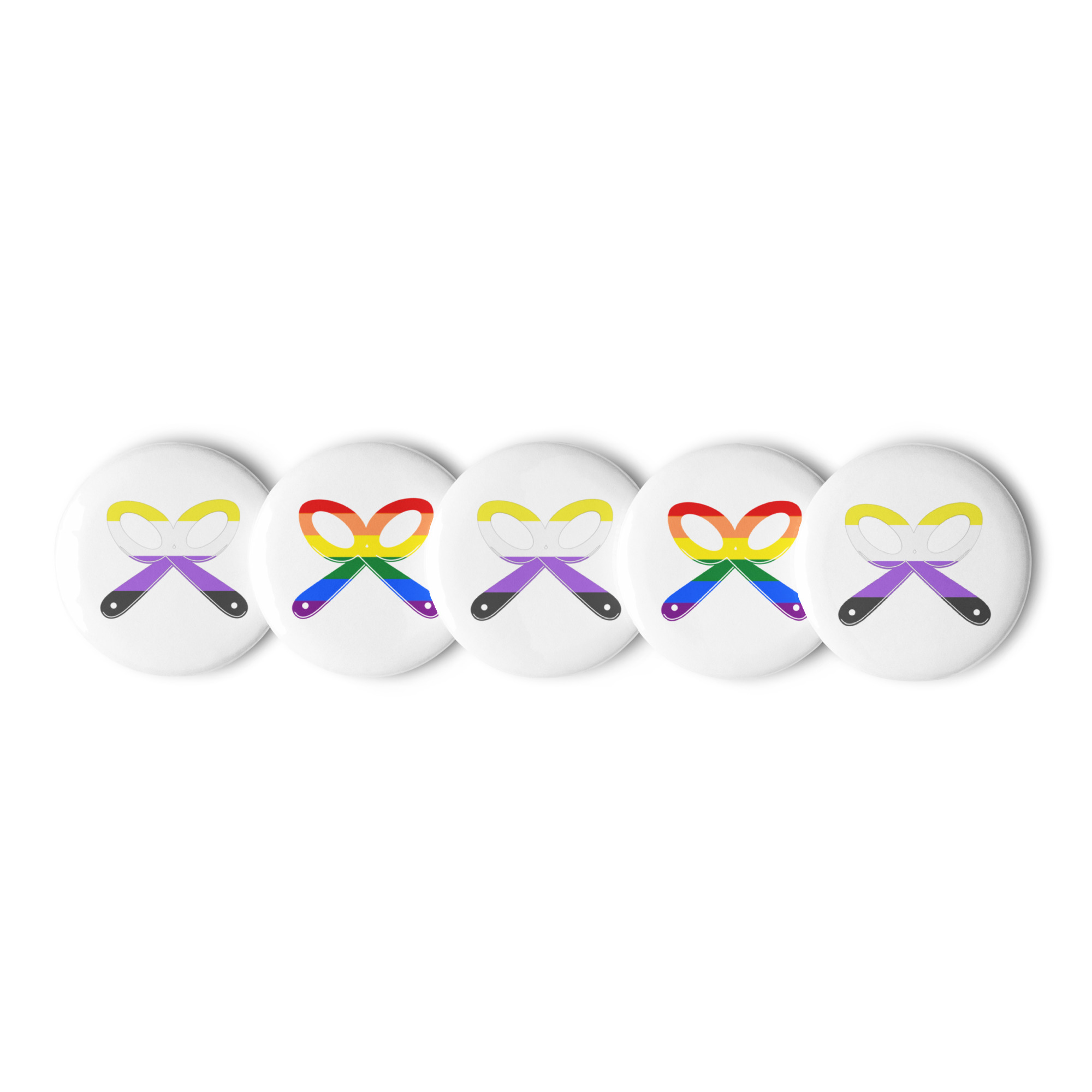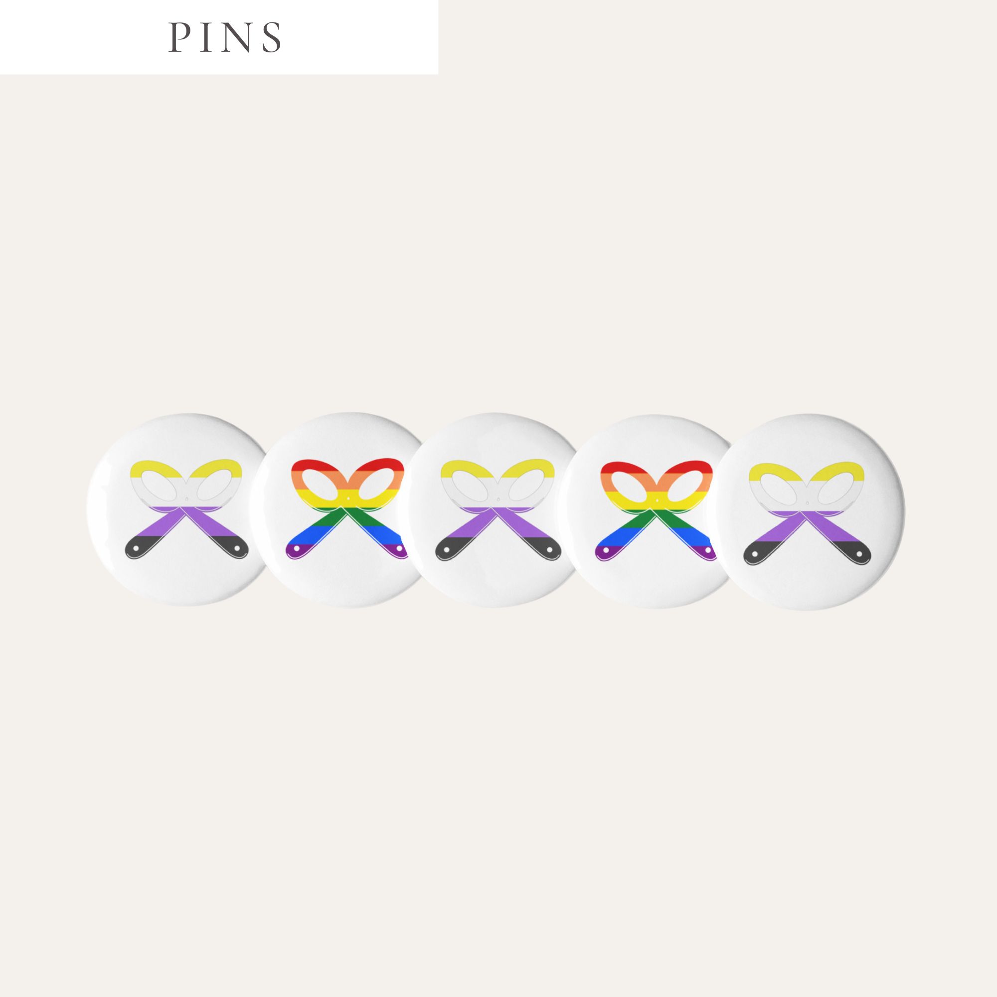 IMAGE ID: Pins With The Non-Binary & LGBTQIA+ Chronic Collective Symbol.