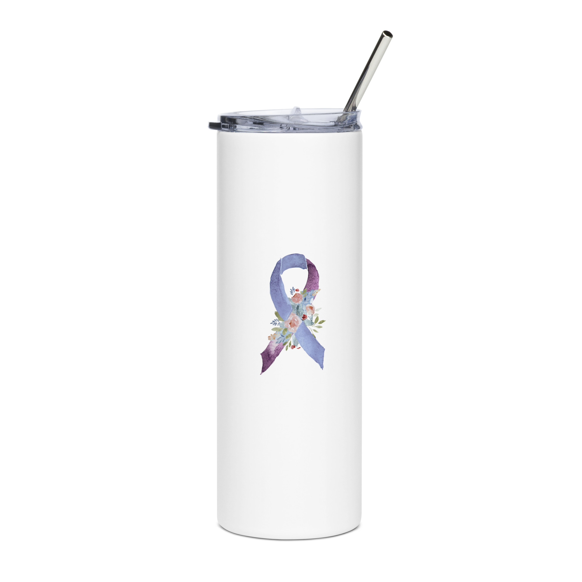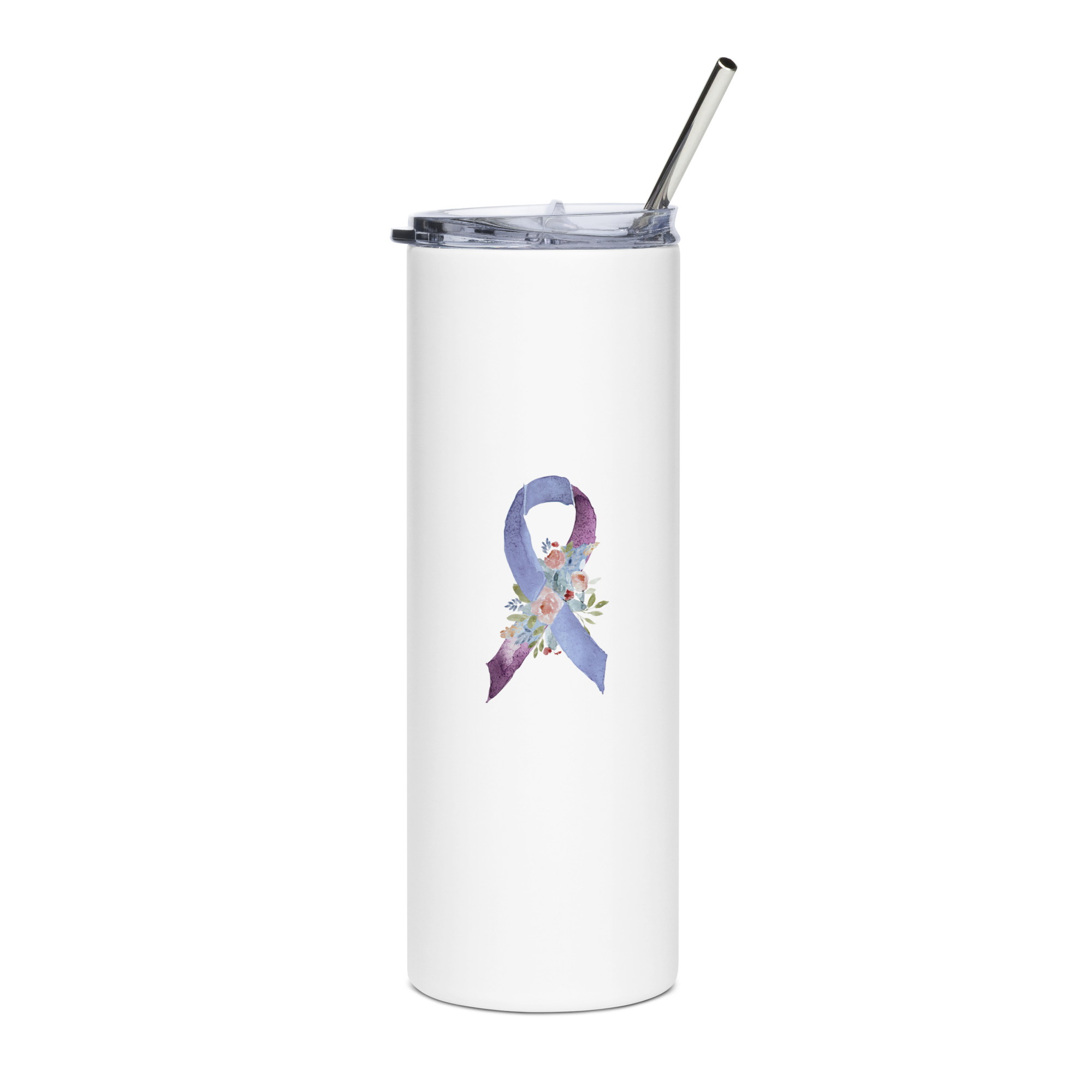 IMAGE ID: White 20oz Tumbler With The Pastel Colored, Floral Awareness Ribbon On Each Side.
