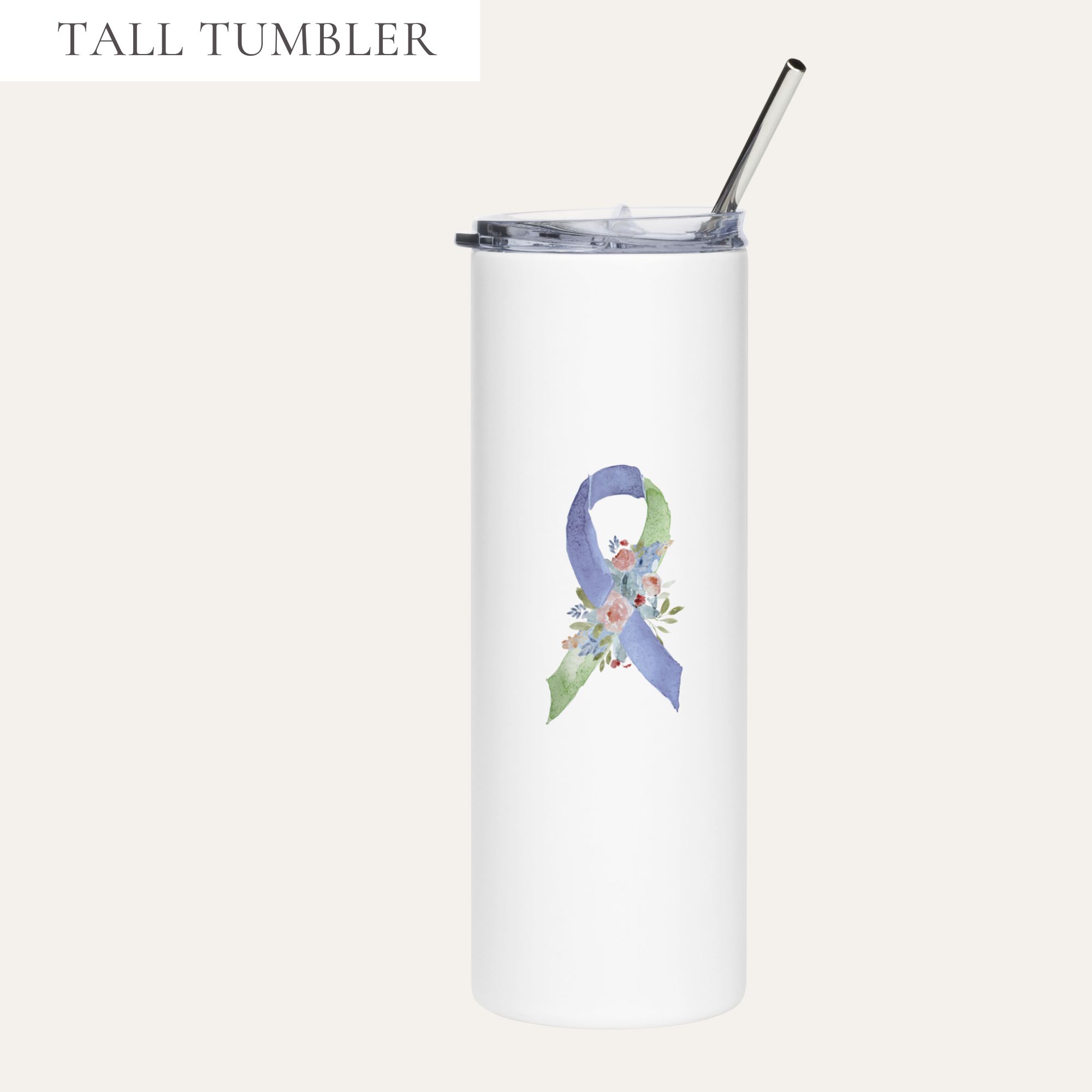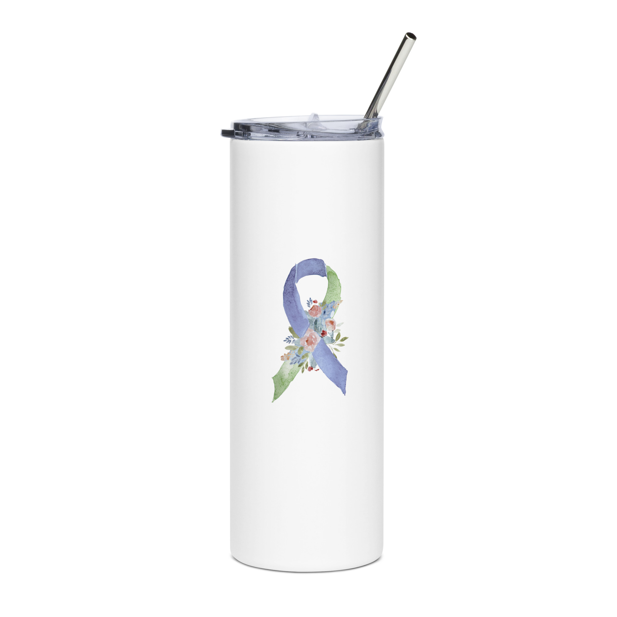 IMAGE ID: White 20oz Tumbler With The Pastel Colored, Floral Awareness Ribbon On Each Side.