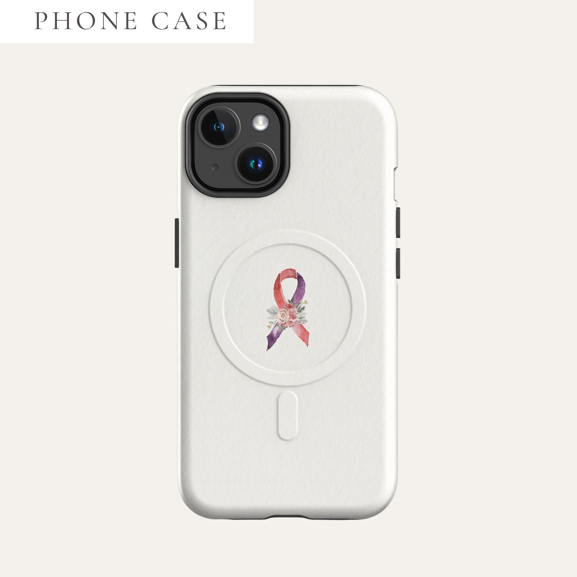 IMAGE ID: Beige Tough Magsafe iPhone Case With The Awareness Ribbon In The Center On The Back.