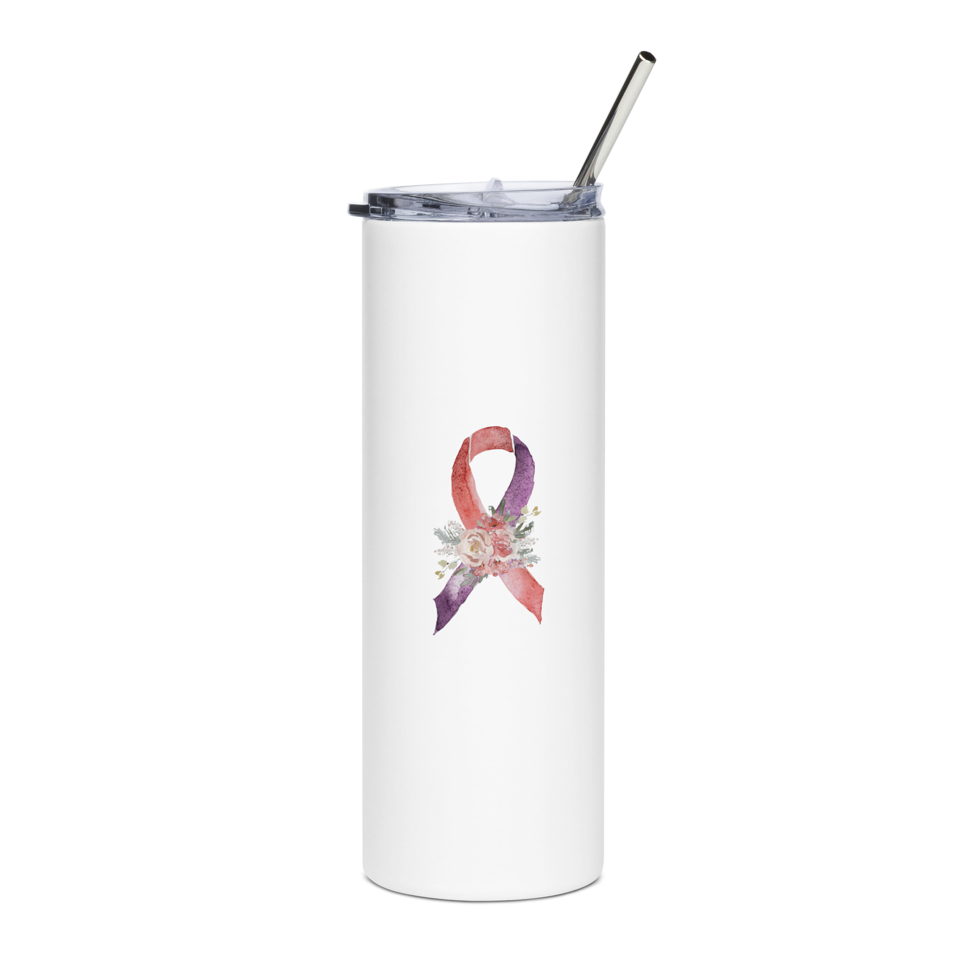 IMAGE ID: White 20oz Tumbler With The Pastel Colored, Floral Awareness Ribbon On Each Side.