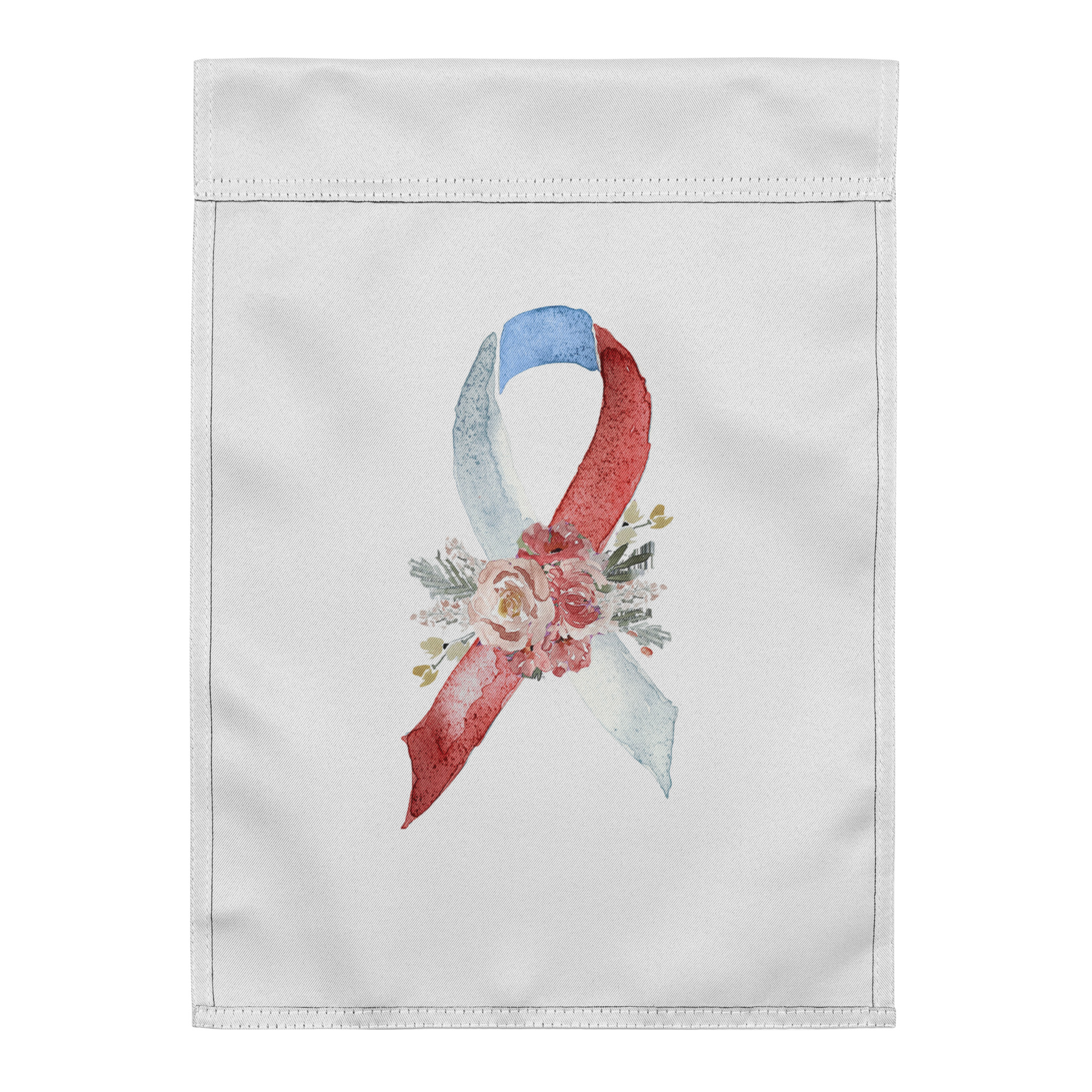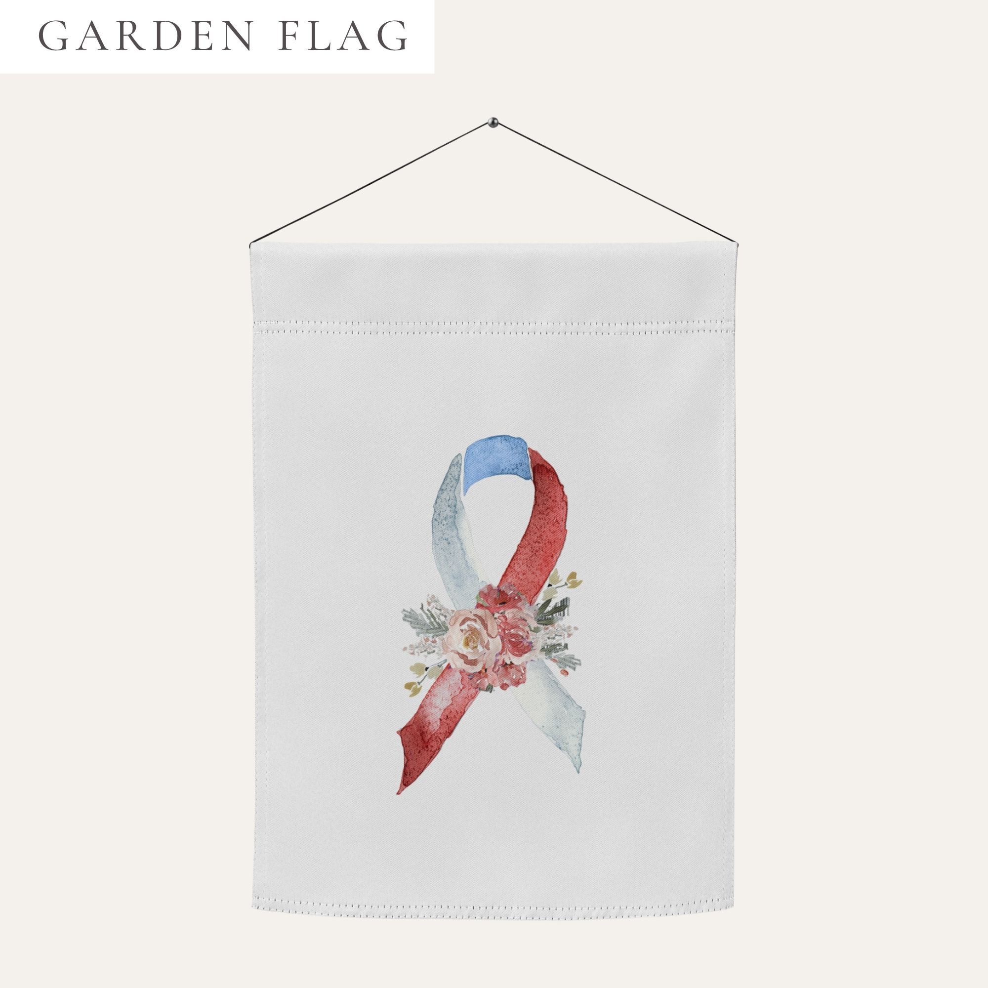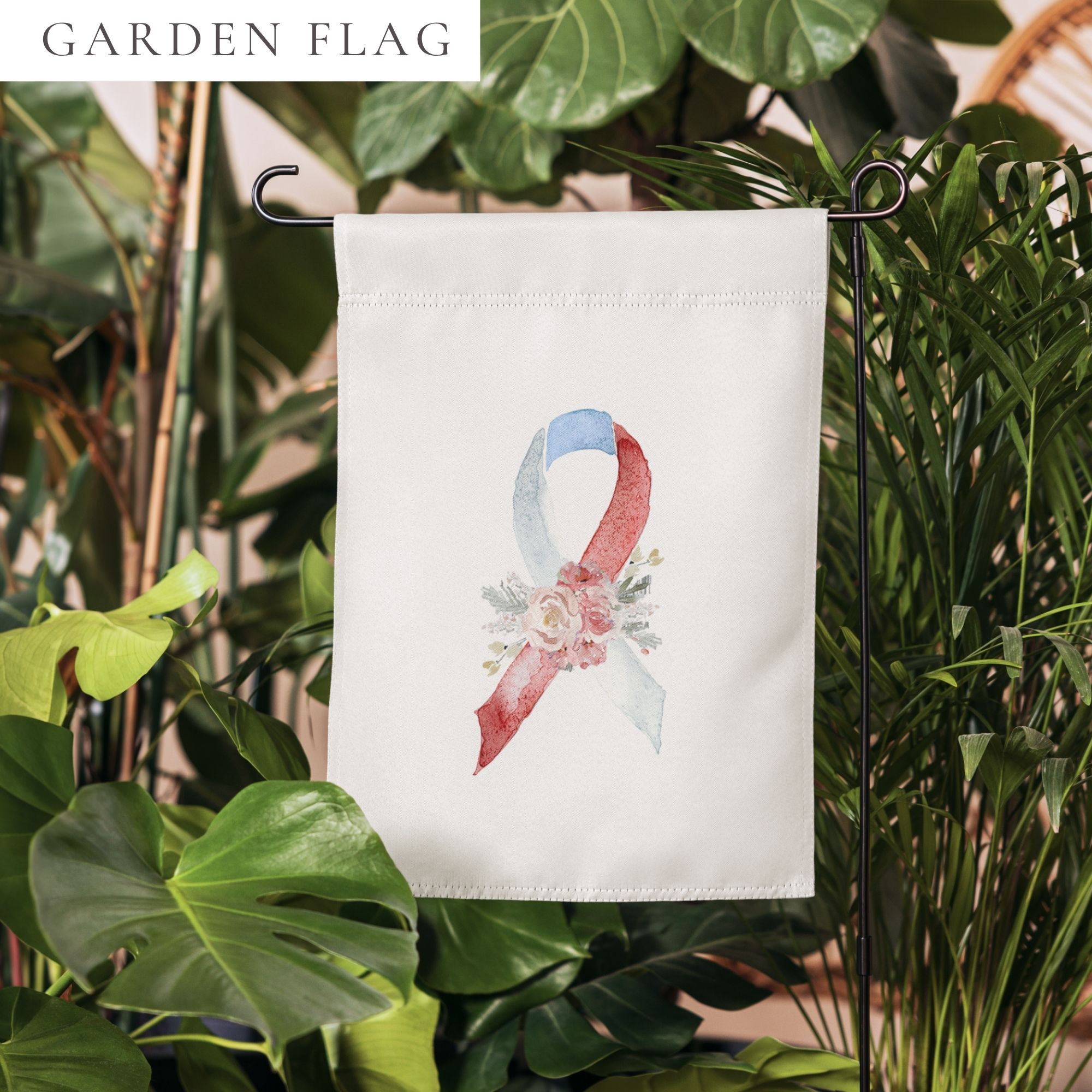 IMAGE ID: White Garden Flag With The Awareness Ribbon In The Center.
