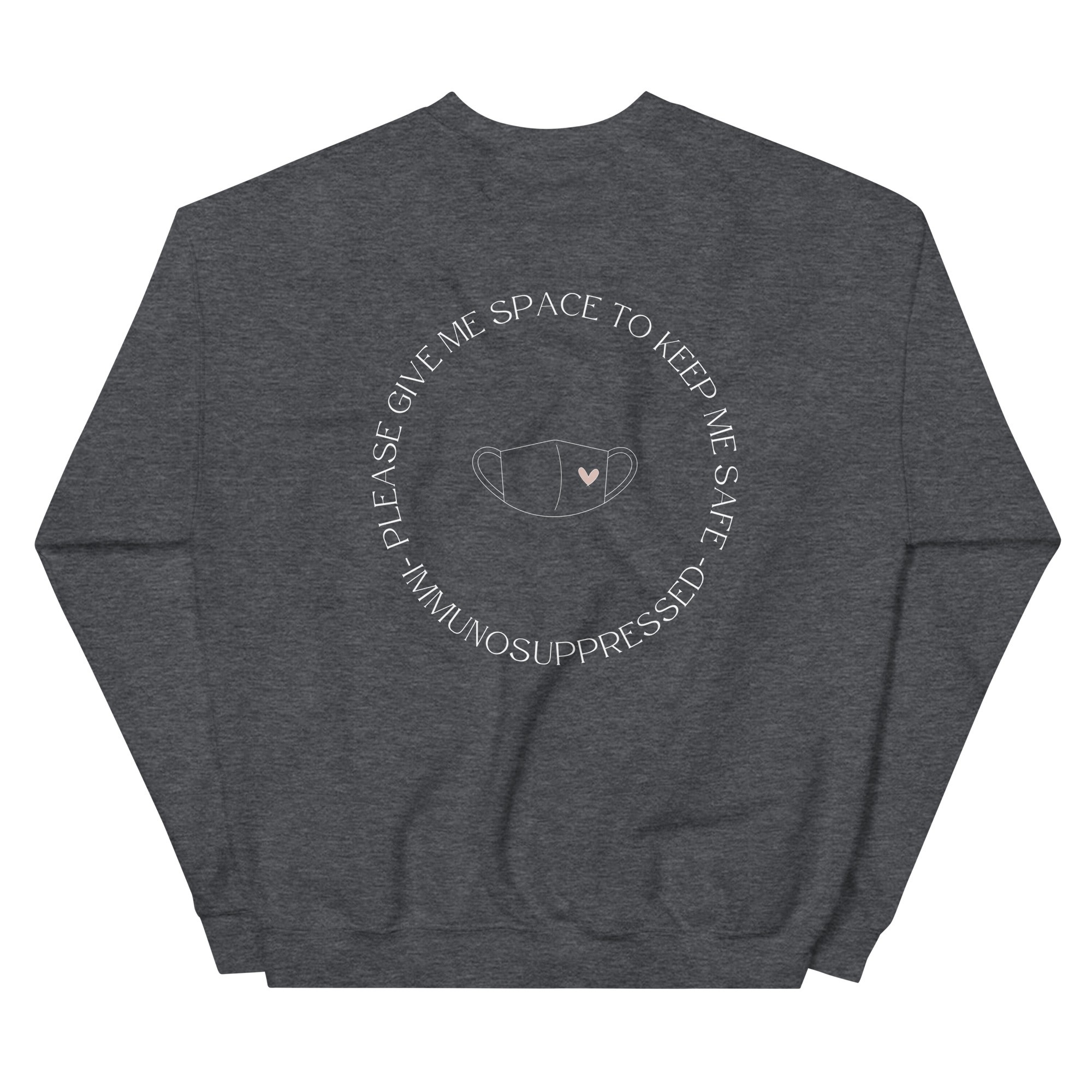 IMAGE ID: Unisex Crewneck. Design Features The Words, “Please Give Me Space To Keep Me Safe – Immunosuppressed” Printed On The Back With A Small Heart Printed On The Front In The Top Left Of The Chest. Available In Multiple Colors.