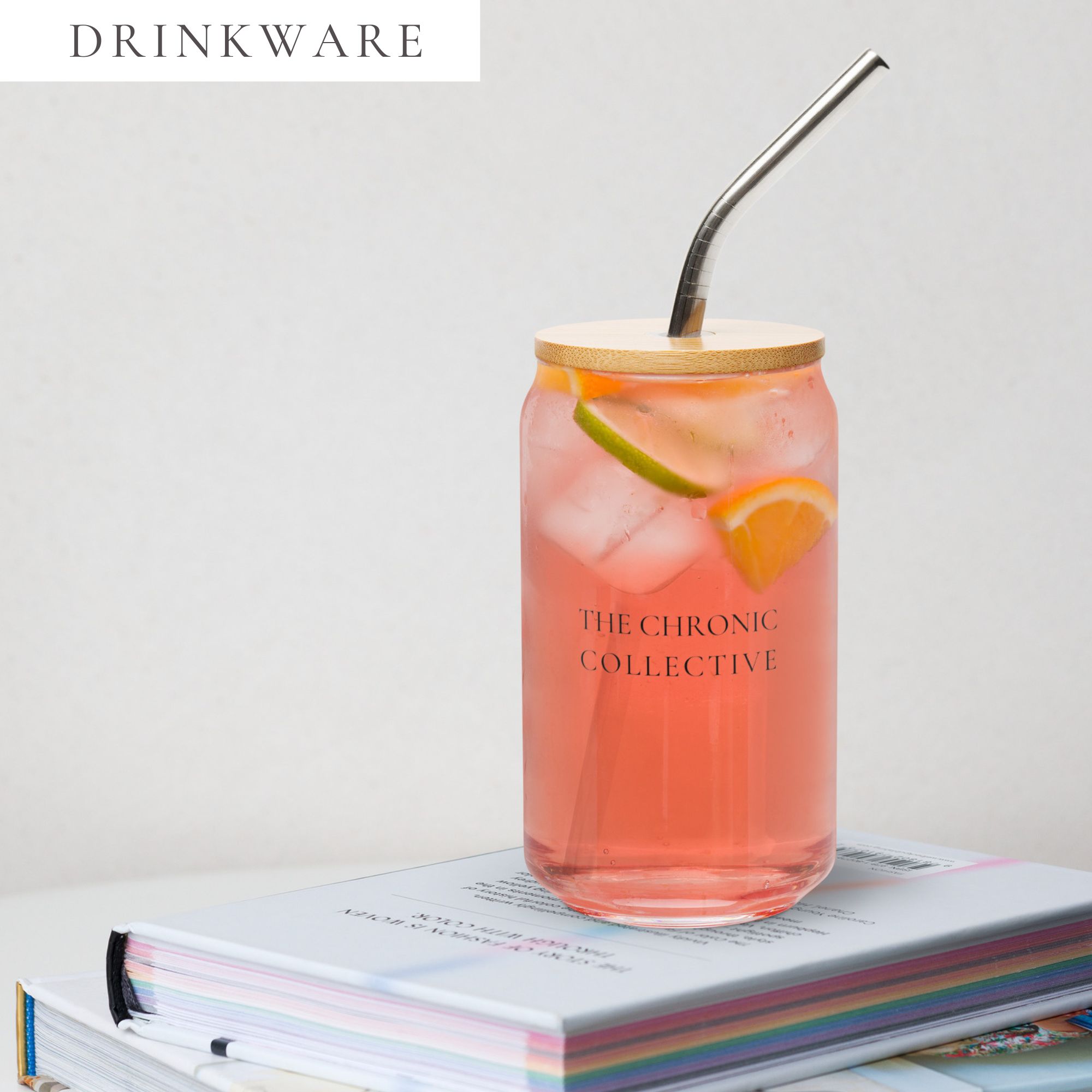 IMAGE ID: Glass Drinkware With Straw And Lid With “The Chronic Collective” On The Front Of It In Black Lettering.
