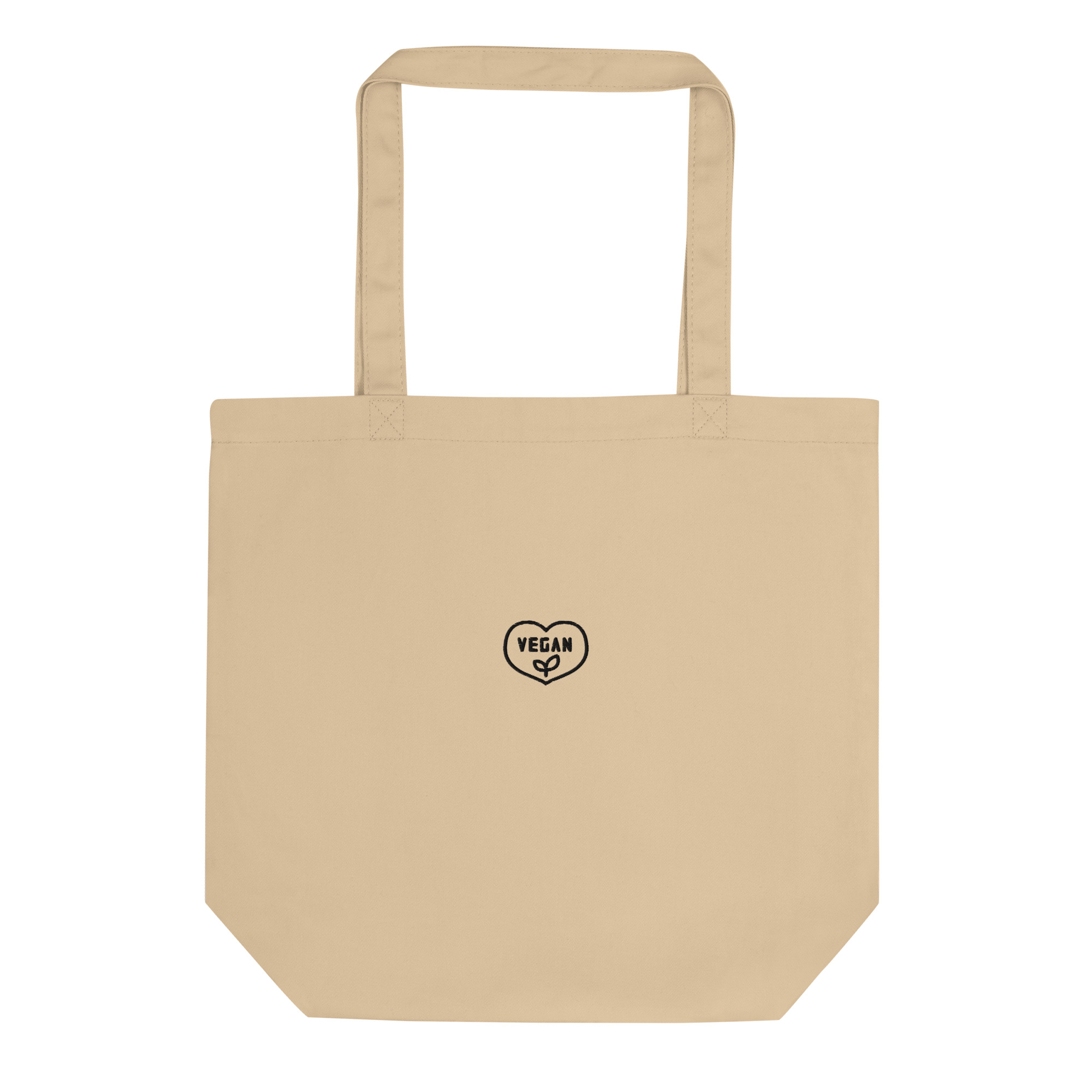 IMAGE ID: Medium Tote Bag Embroidered With The Word ‘Vegan’ Inside Of A Heart In The Center. Available In Black & Oyster Beige.