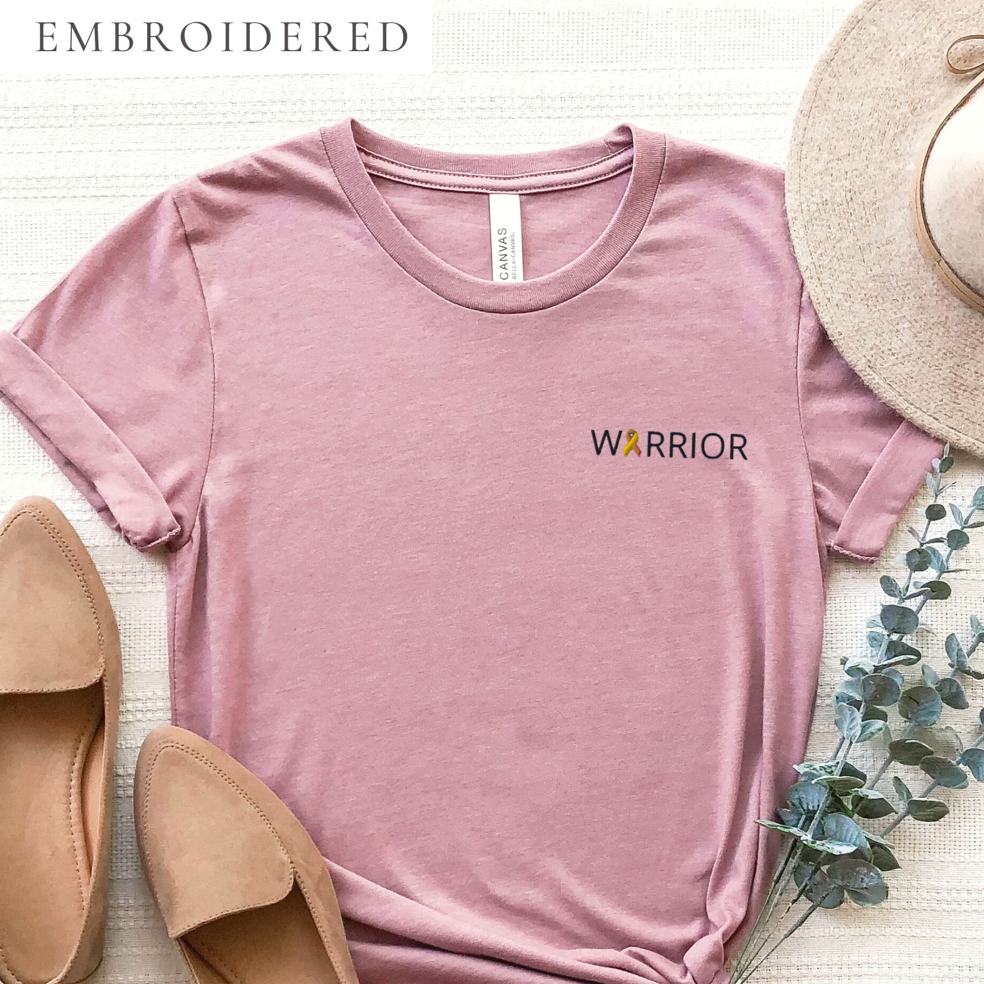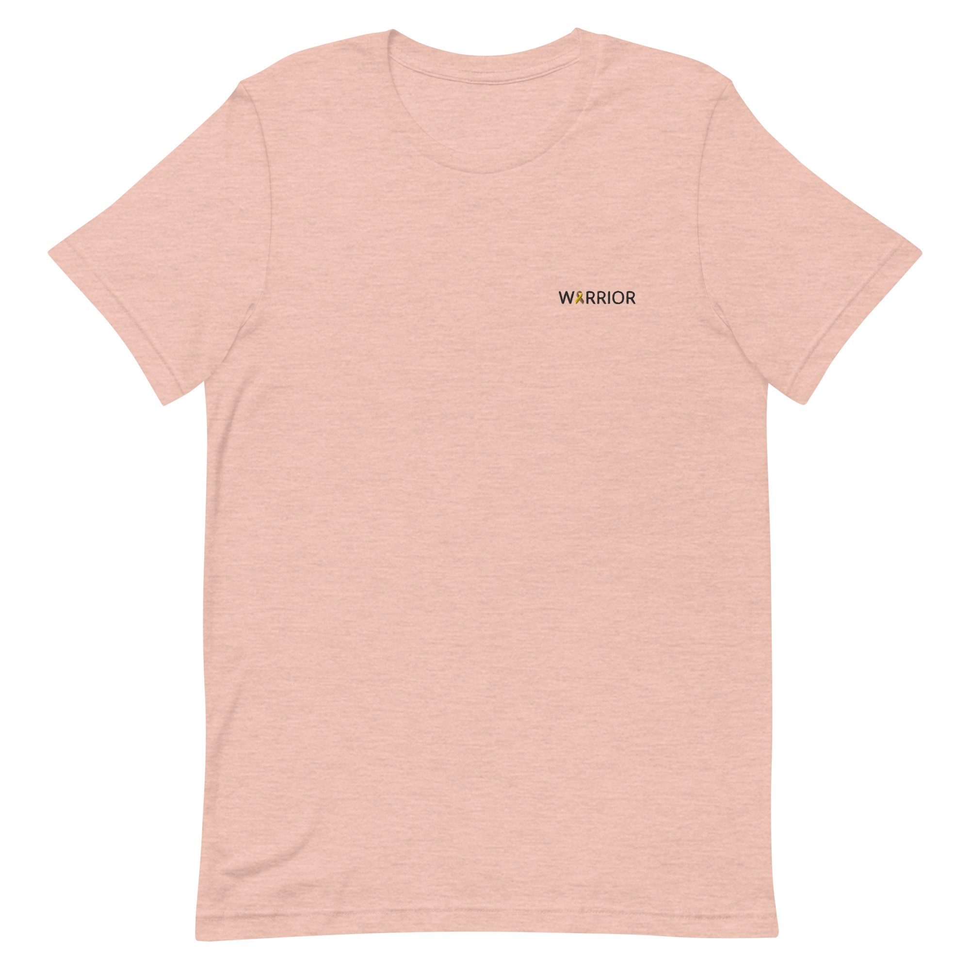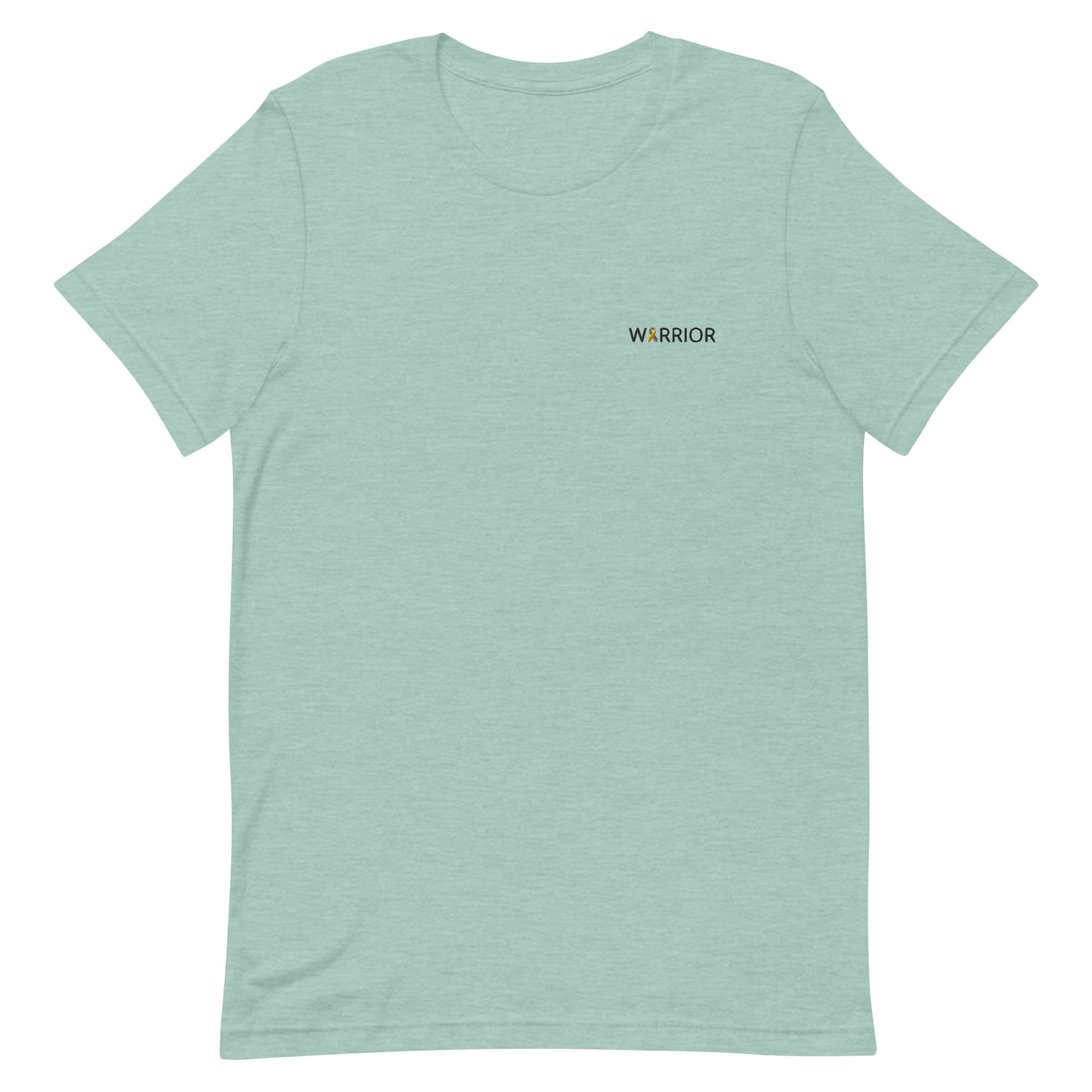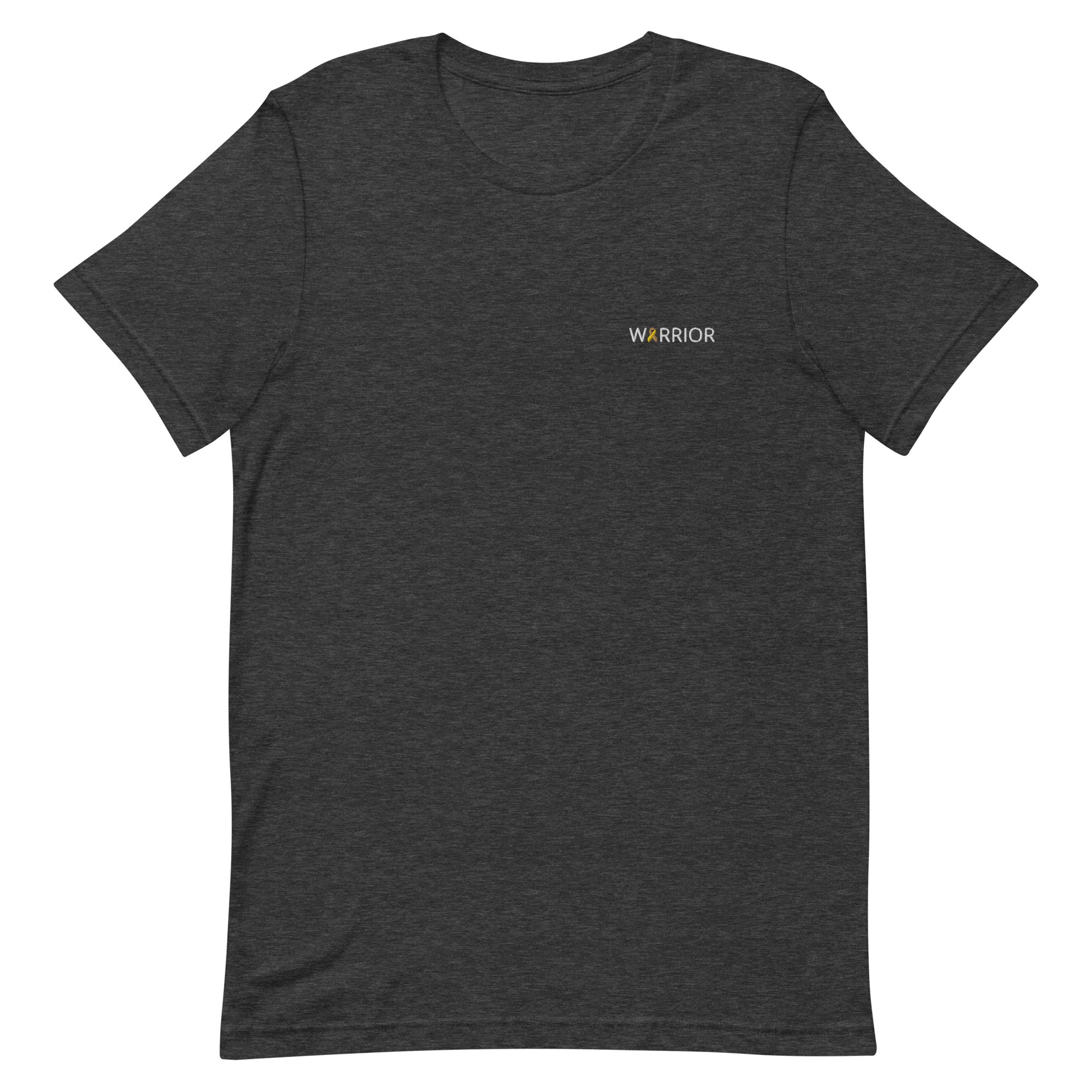 IMAGE ID: Unisex Style T-Shirt. Design Features The Word “WARRIOR” Embroidered With An Awareness Ribbon In Place Of The Letter A. The T-Shirt Is Available In Multiple Colors.