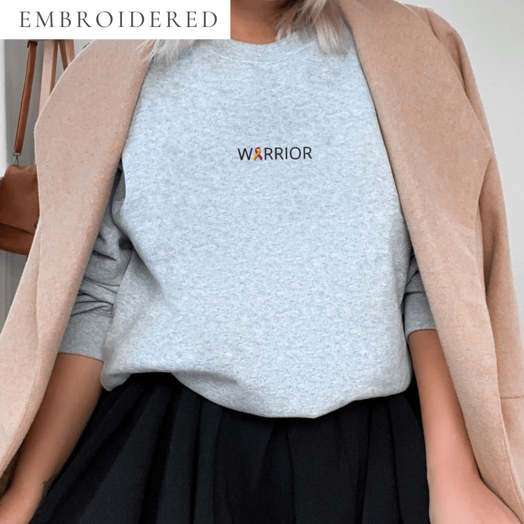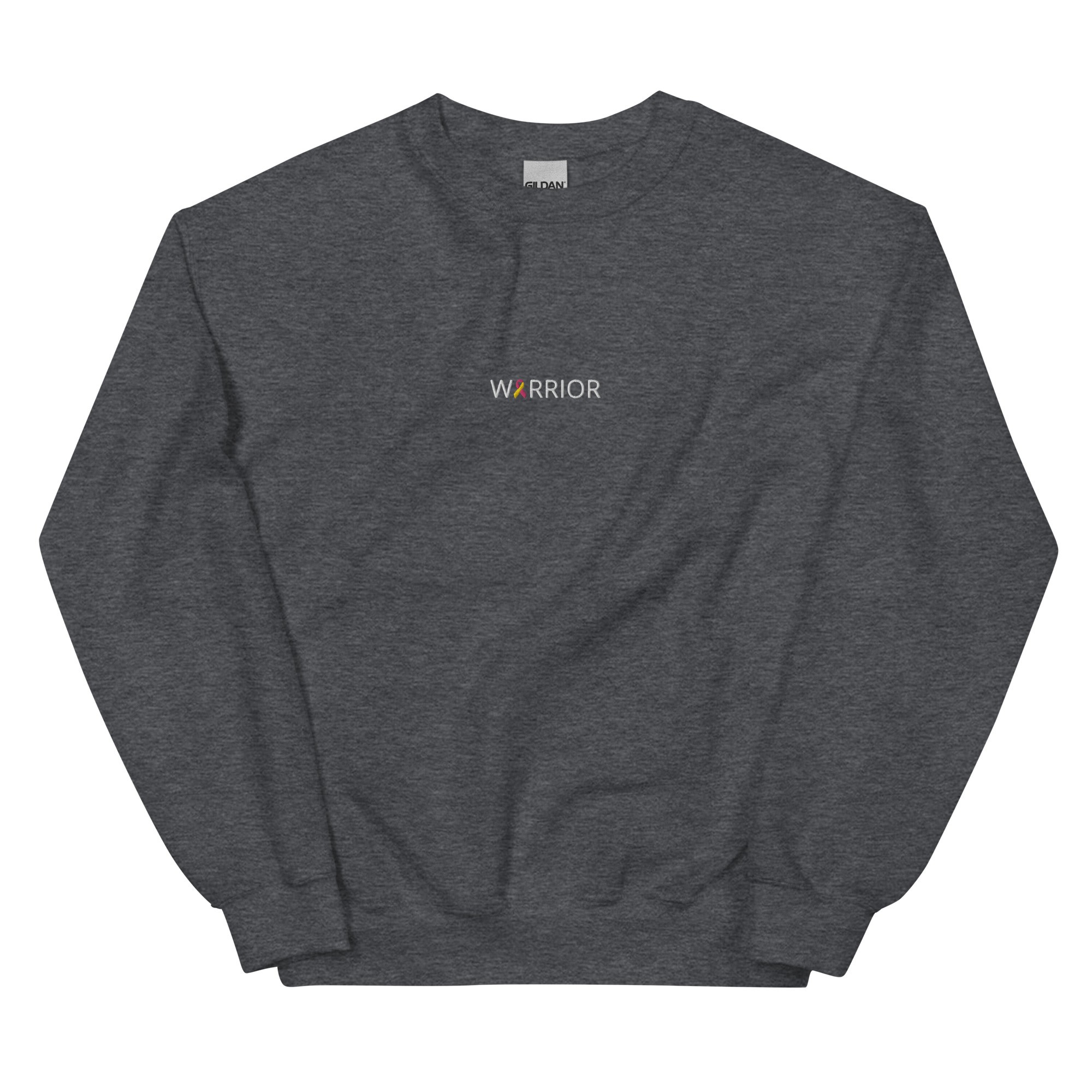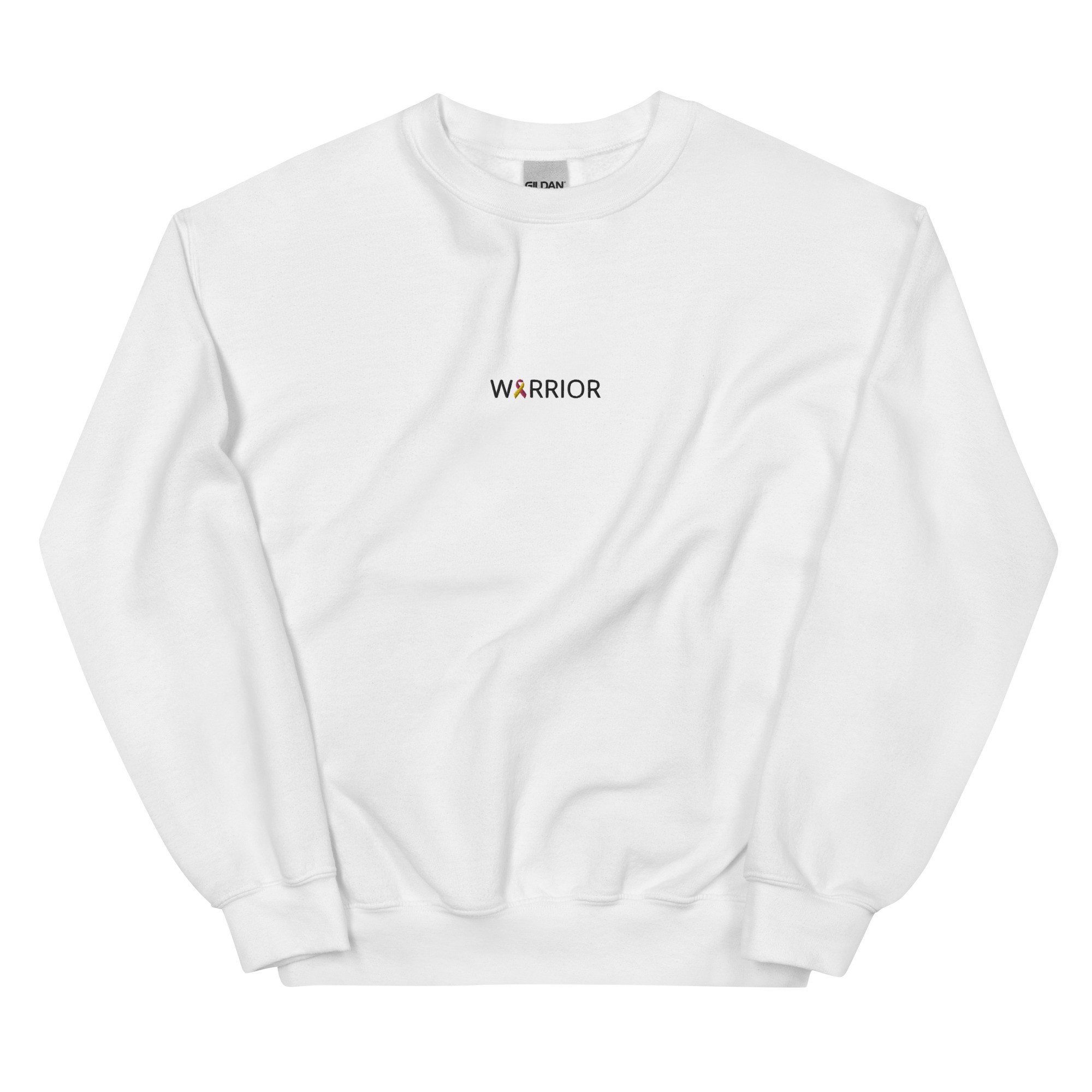 IMAGE ID: Unisex Style Crewneck. Design Features The Word “WARRIOR” Embroidered With An Awareness Ribbon In Place Of The Letter A. The Crewneck Is Available In Multiple Colors.
